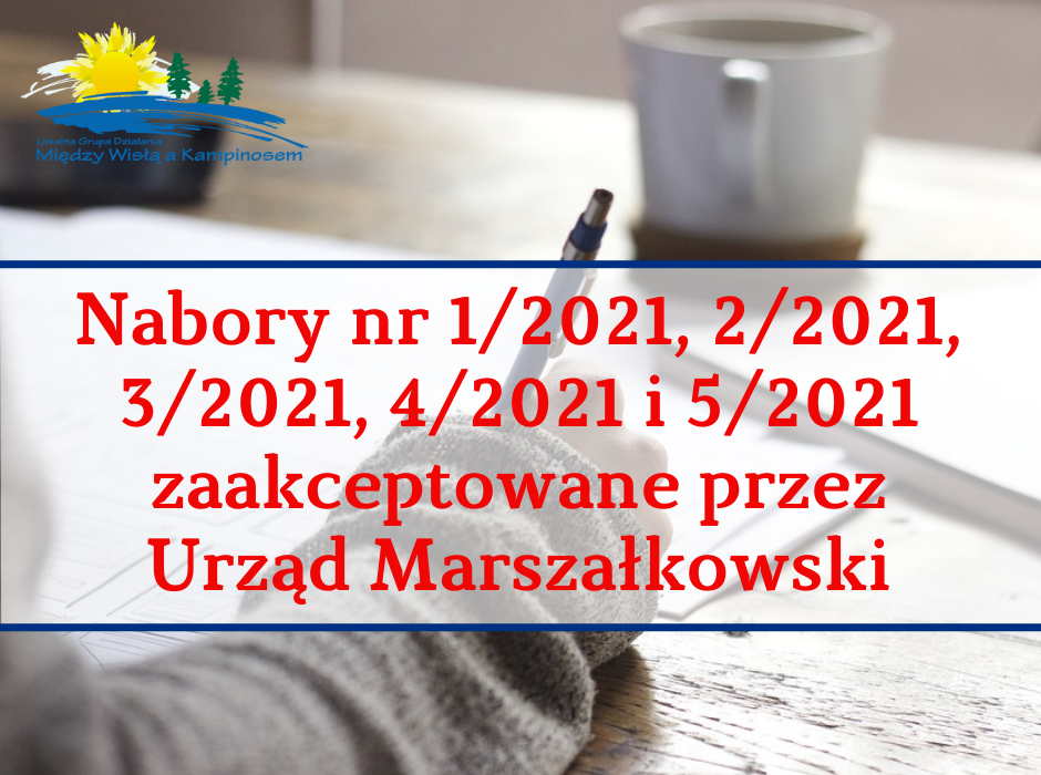 - Nabory wniosków nr 1/2021, 2/2021, 3/2021, 4/2021 oraz 5/2021 przeszły kolejny etap oceny w Urzędzie Marszałkowskim Województwa Mazowieckiego (nabory zostały zaakceptowane).