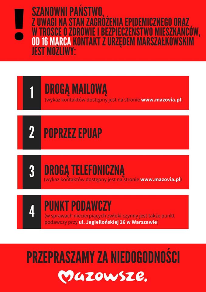 Zarząd Województwa Mazowieckiego wprowadza ograniczenia w pracy urzędu marszałkowskiego i podległych jednostek w tym Departamentu Rolnictwa i Rozwoju Obszarów Wiejskich ul. Skoczylasa 4.