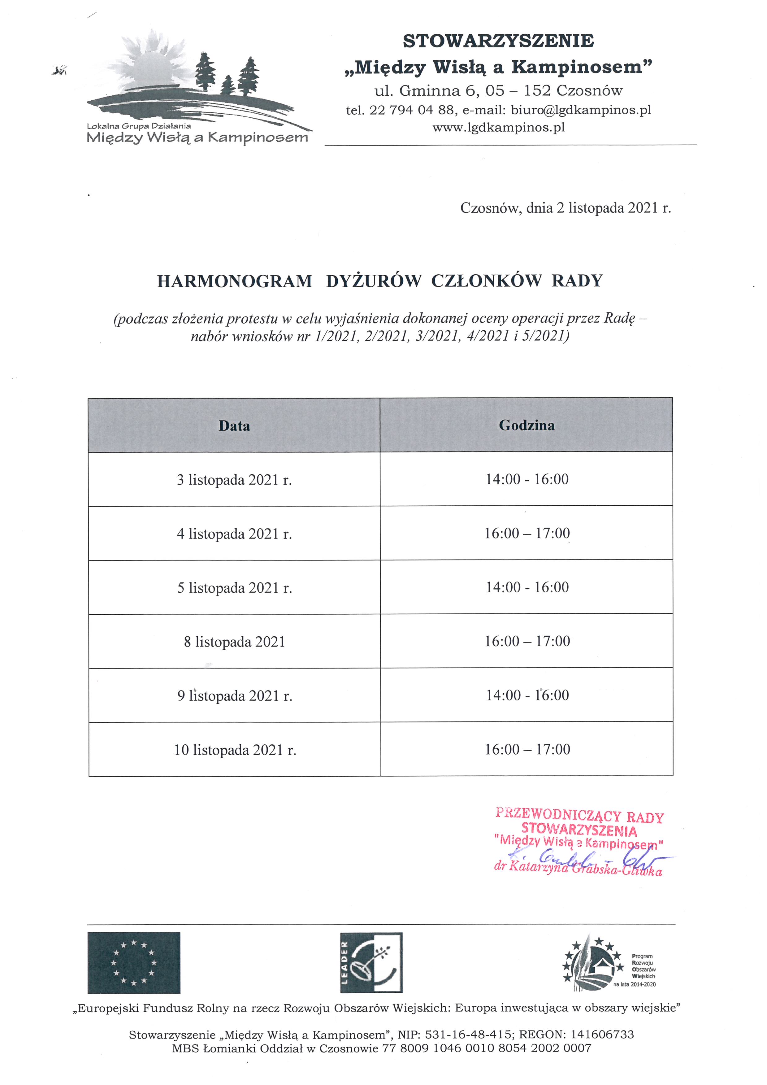 Członkowie Rady ustalili harmonogram dyżurów w Biurze Stowarzyszenia "Między Wisłą a Kampinosem" podczas możliwości złożenia protestu w celu wyjaśnienia dokonanej oceny operacji przez Radę (zgodnie z § 6 ust. 56 i 57 Procedury oceny i wyboru operacji w ramach poddziałania "Wsparcie na wdrażanie operacji w ramach strategii rozwoju lokalnego kierowanego przez społeczność" objętego PROW 2014-2020 realizowanych przez podmioty inne niż LGD).