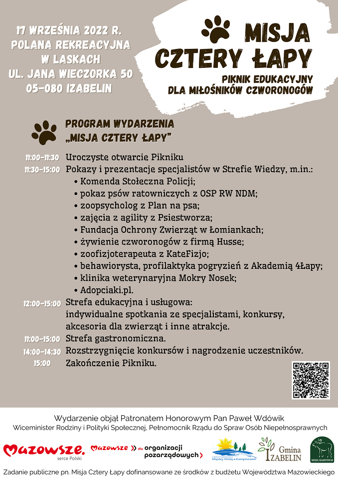 Zadanie publiczne pn. Misja Cztery Łapy dofinansowane ze środków z budżetu Województwa Mazowieckiego.