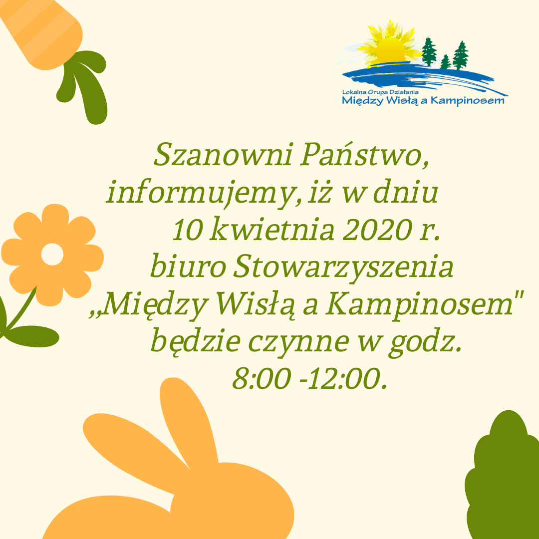 Godziny pracy Stowarzyszenia "Między Wisłą a Kampinosem" w dniu 10 kwietnia 2020 r. (piątek).