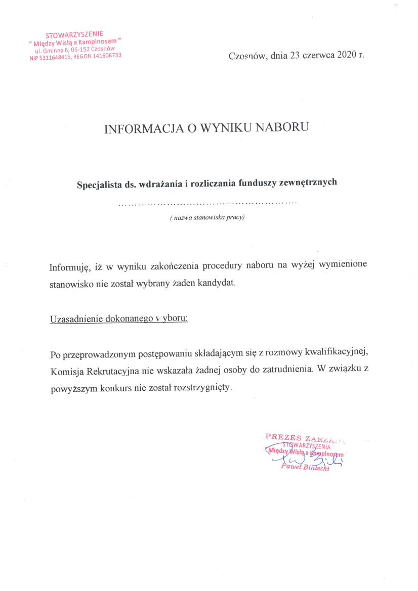 Informuję, iż w wyniku zakończenia procedury naboru na wyżej wymienione stanowisko nie został wybrany żaden kandydat.