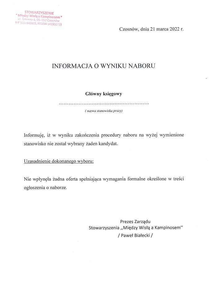 Informujemy, iż w wyniku zakończenia procedury naboru na stanowisko główny księgowy nie został wybrany żaden kandydat.
