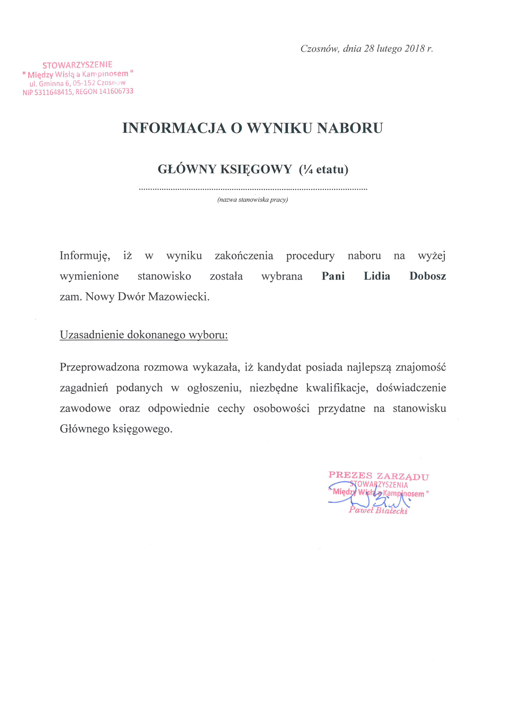 Informuję, iż w wyniku zakończenia procedury naboru na wyżej wymienione stanowisko została wybrana Pani Lidia Dobosz zam. Nowy Dwór Mazowiecki.