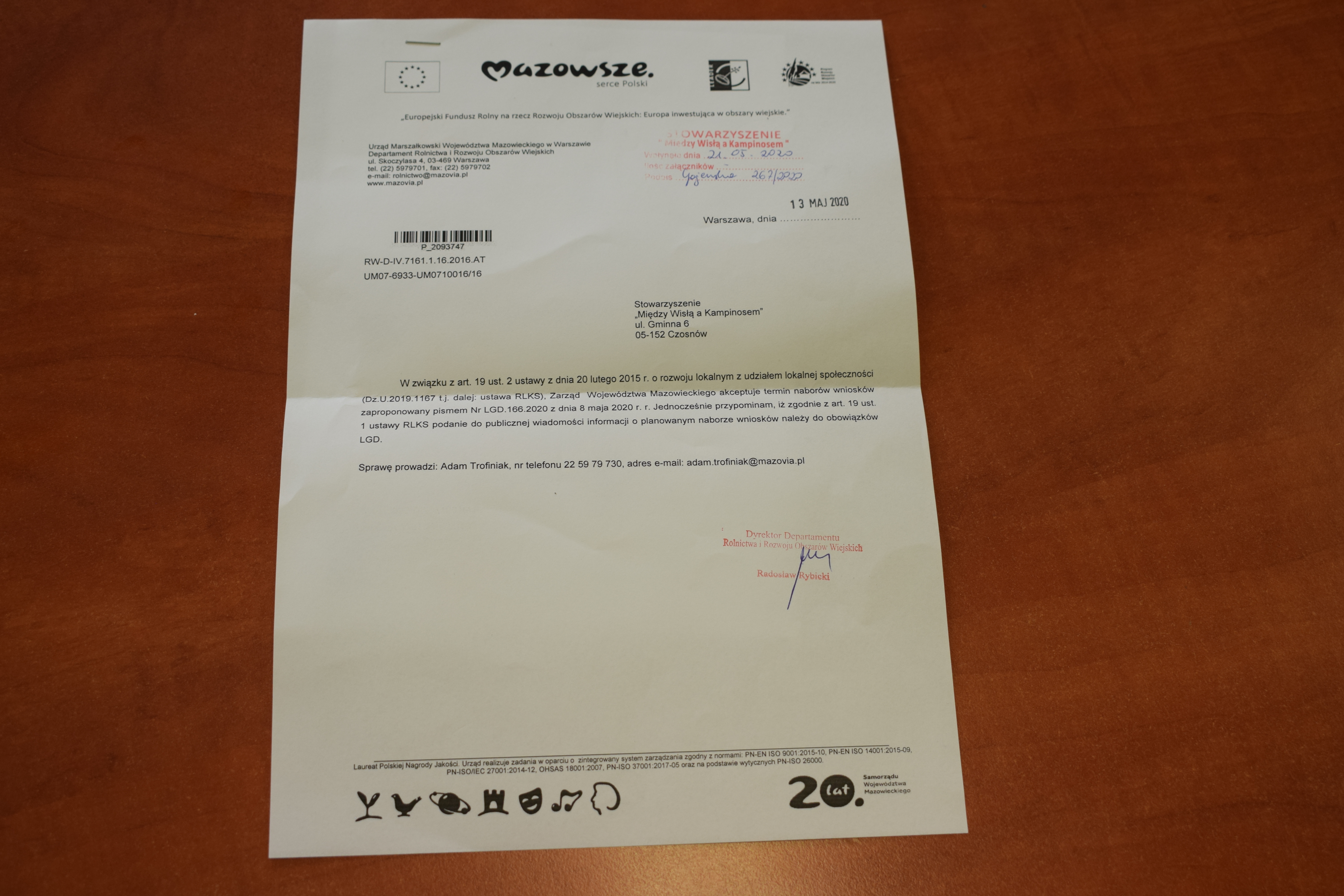 Pracownicy Stowarzyszenia "Między Wisłą a Kampinosem" będą przyjmować wnioski od 17 czerwca 2020 r. do 30 czerwca 2020 r.
