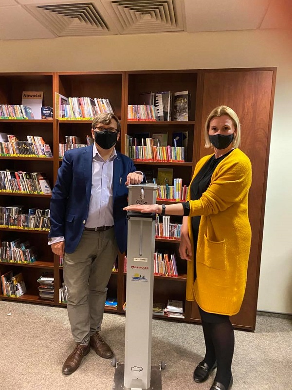 zakupione w ramach projektu pn. "Zakup nożnych dozowników płyny do dezynfekcji w ramach walki z