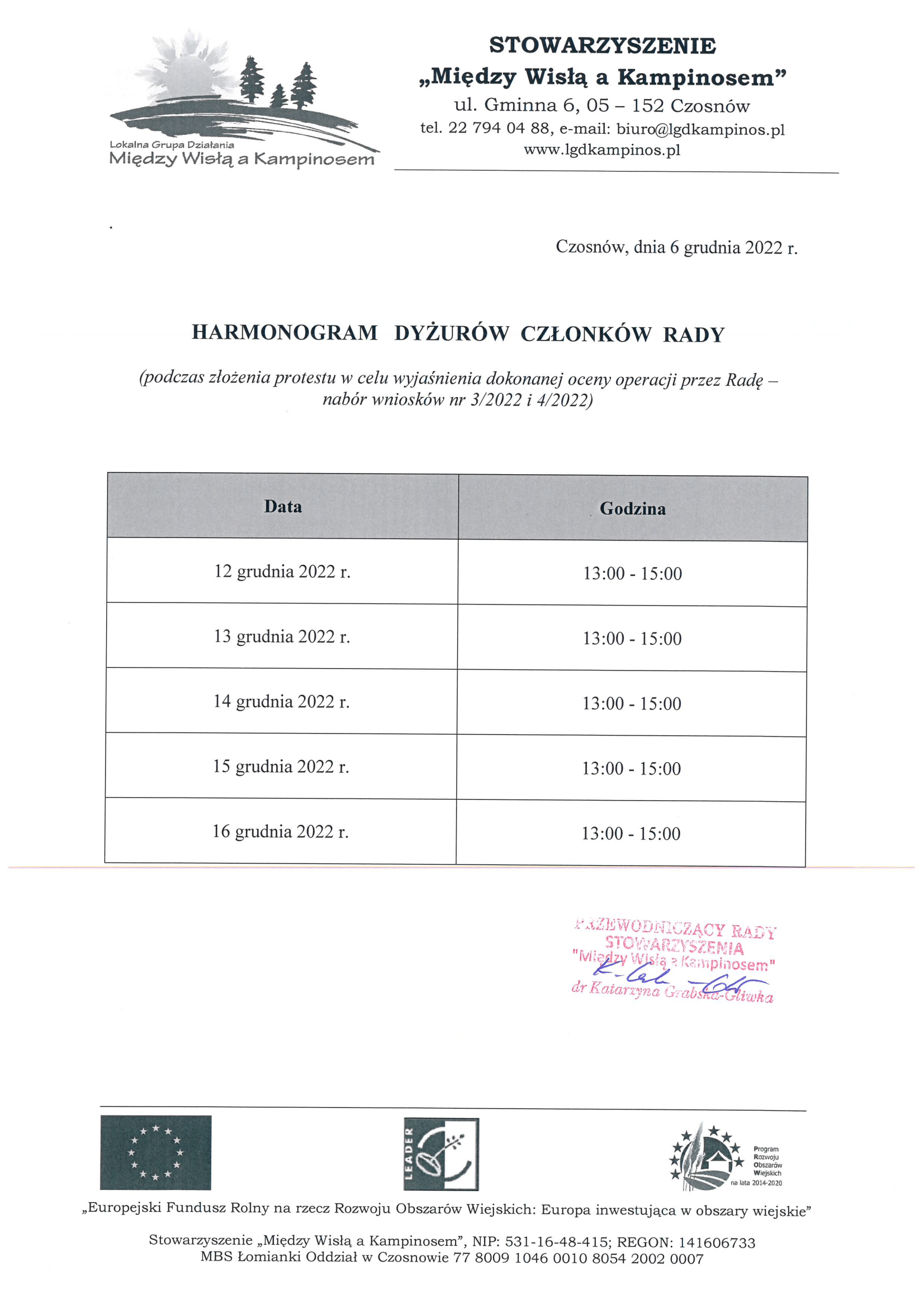 Członkowie Rady  Stowarzyszenia ,,Między Wisłą a Kampinosem'' ustalili harmonogram dyżurów w biurze naszego stowarzyszenia podczas możliwości złożenia protestu w celu wyjaśnienia dokonanej oceny operacji przez Radę.