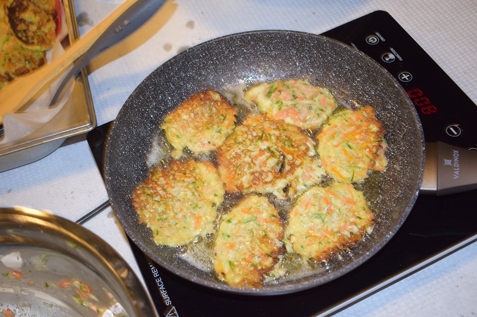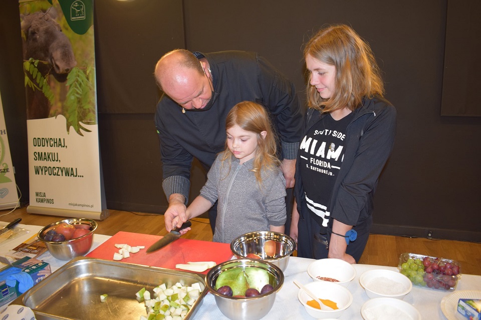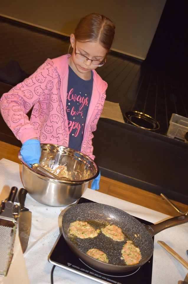 Uczestnicy pojedynczo lub w grupach mieli okazję przyrządzić dania mączne, mięsne i desery. Warsztaty opierały się przede wszystkim na praktyce, ale Pan Darek i Pan Tomasz z chęcią dzielili się tajnikami warsztatu kucharza. Szczególną radość z gotowania miały dzieci, które licznie zagościły w naszej zaimprowizowanej kuchni. Bardzo uważaliśmy na palce więc obyło się bez rozlewu krwi.