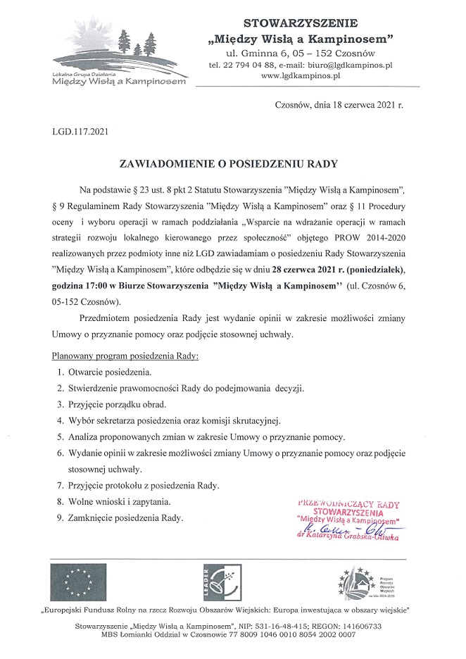 Przewodniczący Rady Stowarzyszenia "Między Wisłą a Kampinosem" zawiadamia, iż