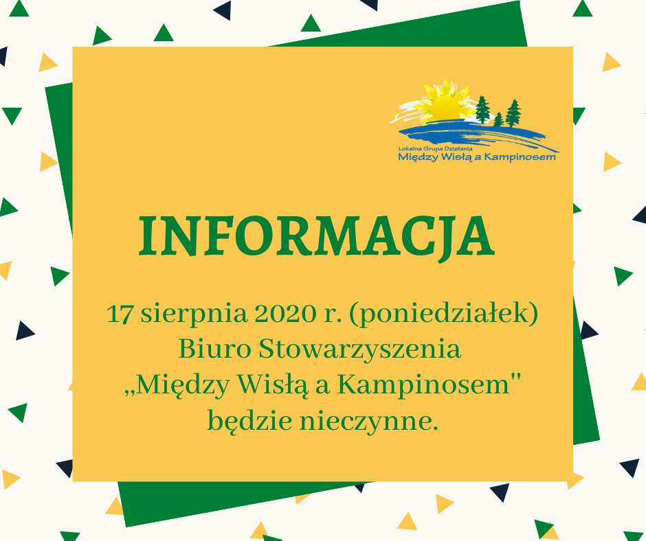 Informujemy, że w dniu 17 sierpnia 2020 r. (poniedziałek) Biuro