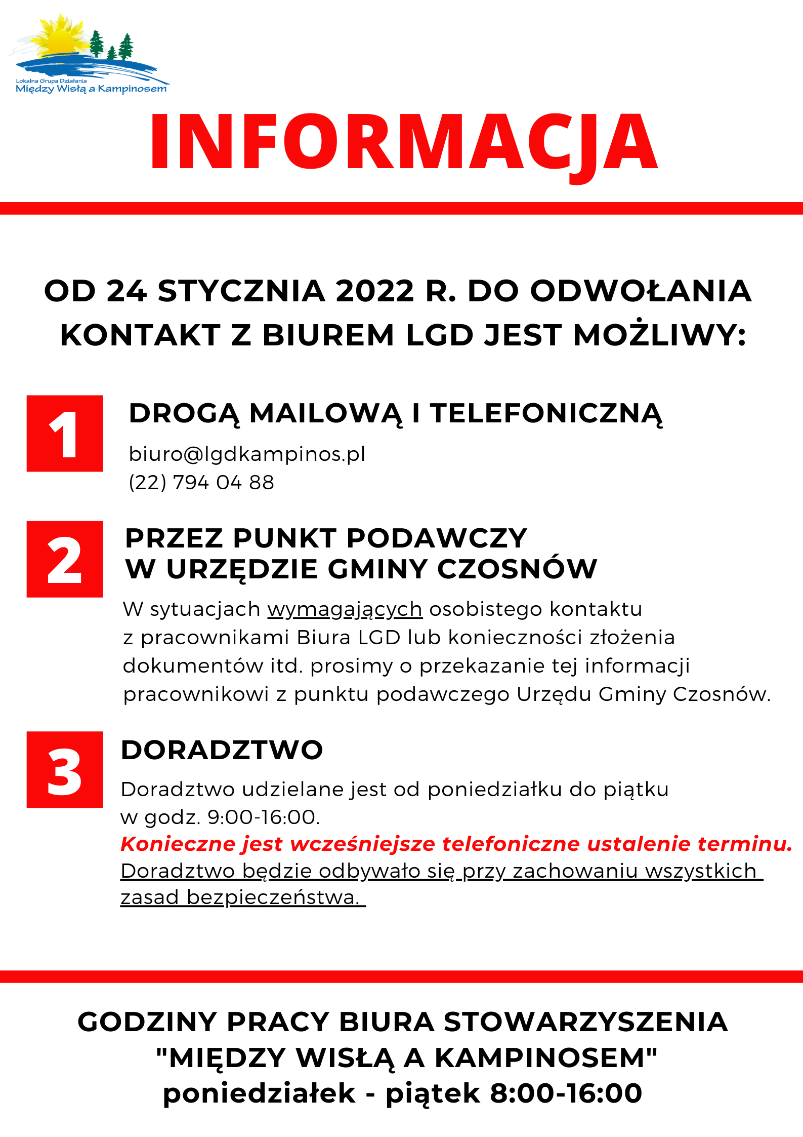 Przypominamy o konieczność uprzedniego telefonicznego umówienia doradztwa z pracownikiem Biura Stowarzyszenia "Między Wisłą a Kampinosem" .