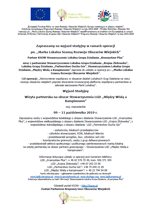 Zapraszamy na wyjazd studyjny w ramach operacji pn. ,,Marka Lokalna