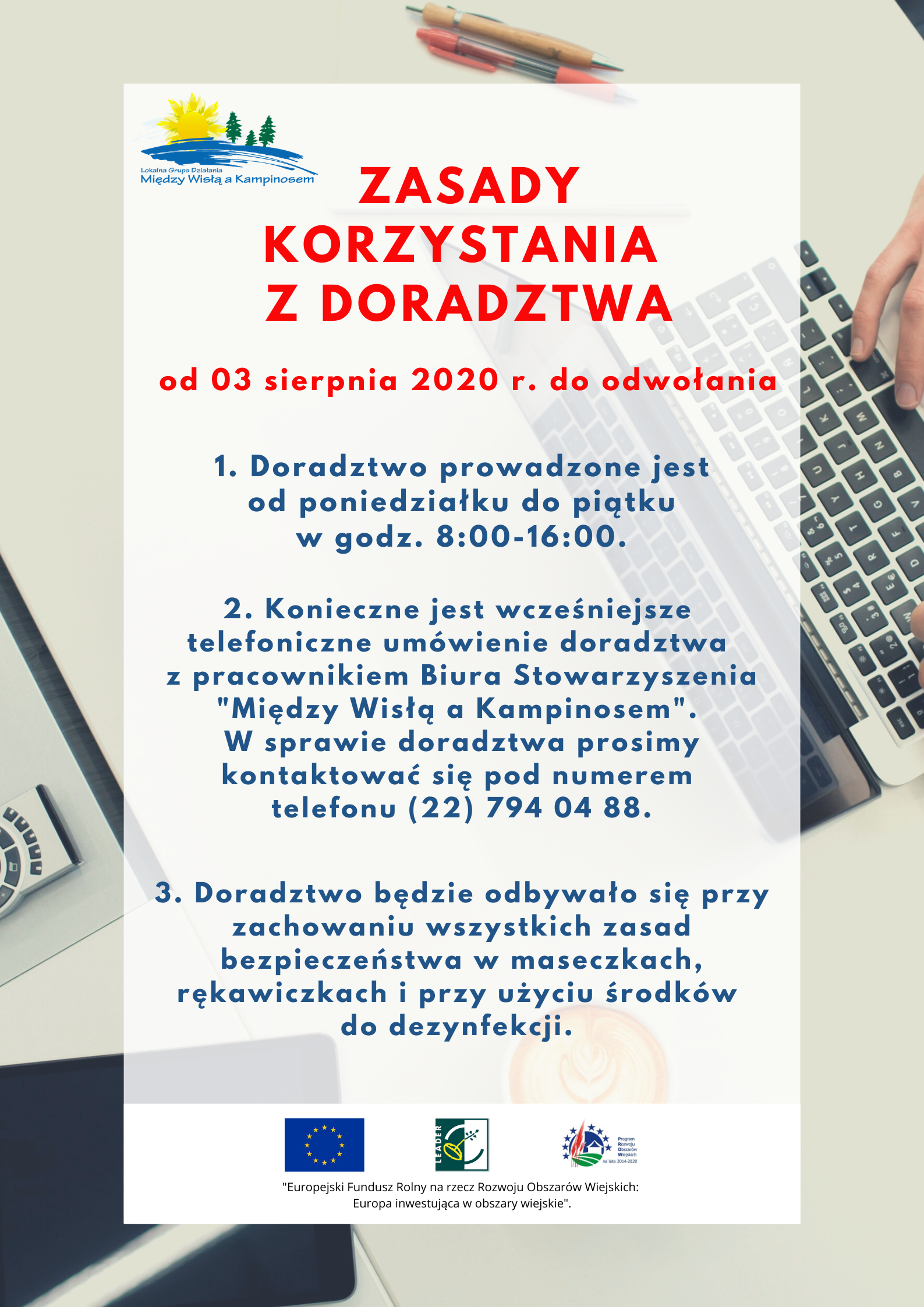 Zasady korzystania z doradztwa przez pracowników Biura Stowarzyszenia "Między Wisłą a Kampinosem" od 03 sierpnia br. do odwołania!