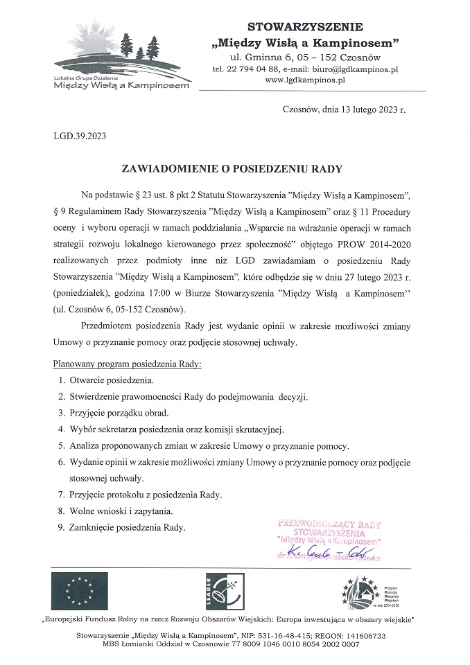Przewodniczący Rady Stowarzyszenia "Między Wisłą a Kampinosem" zawiadamia, iż