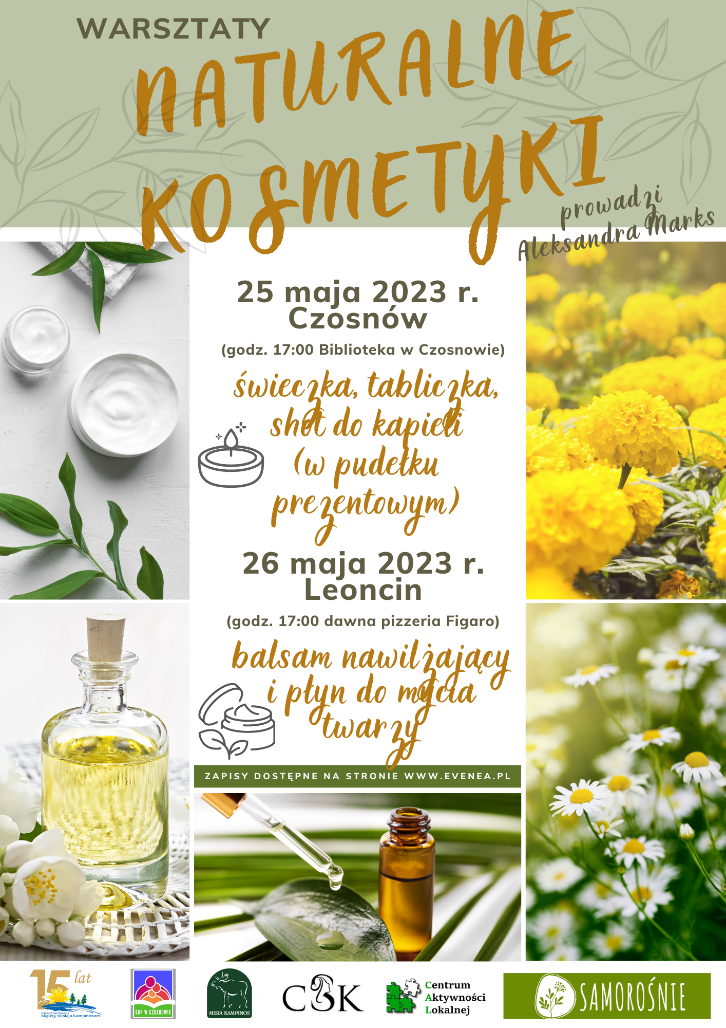 Podczas warsztatów będziecie mieli okazję poznać tajniki tworzenia naturalnych kosmetyków oraz poznać składniki, które znajdują się w nich. Nasze warsztaty poprowadzi Aleksandra Marks (Samorośnie/ Ziołoteka ), która z pewnością zaraża swoją pasją do tworzenia kosmetyków naturalnych.