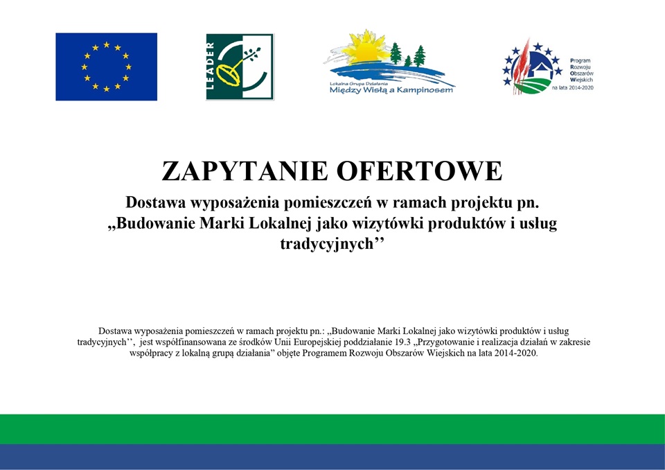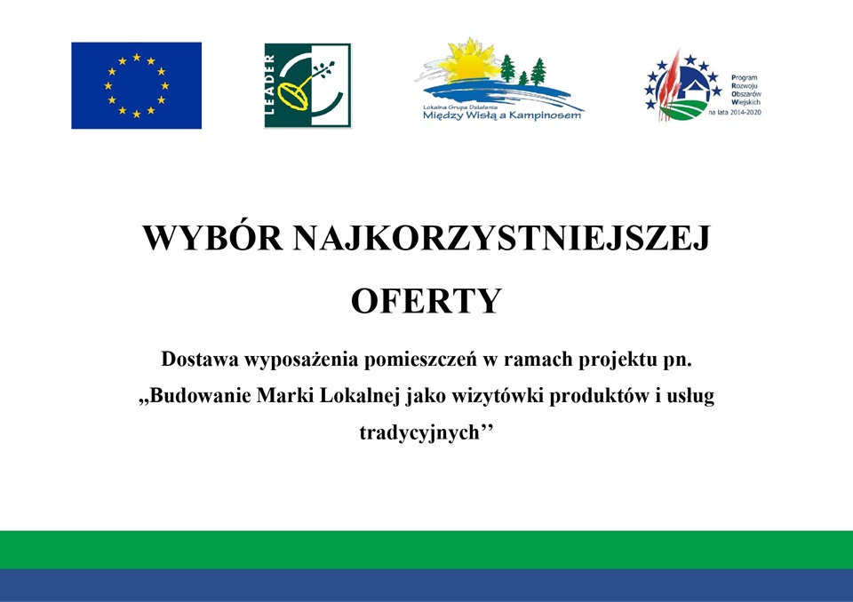 W wyniku przeprowadzonego postępowania - zaproszenia do złożenia oferty w projekcie współpracy pn. "Budowanie Marki Lokalnej jako wizytówki produktów i usług tradycyjnych" Stowarzyszenie "Między Wisłą a Kampinosem" wybrało ofertę złożoną przez firmę ADAM KRUPA REJTAN.